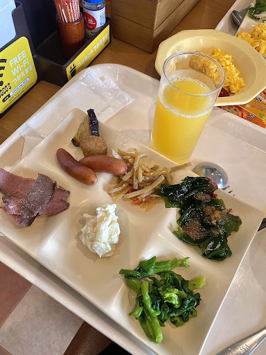 ローストビーフ、 ウインナー スクランブルエッグ ハッシュポテト 青菜のおひたし ししゃものフライ、コロッケ ナスと肉団子の煮物 きんぴらごぼう グリーンサラダ、ポテトサラダ 海藻、 オレンジ、、みつ豆寒天 納豆、海苔、生卵、 パン、ワッフル ご飯、お味噌汁、コーンスープ カレー うどん ドリンクバー