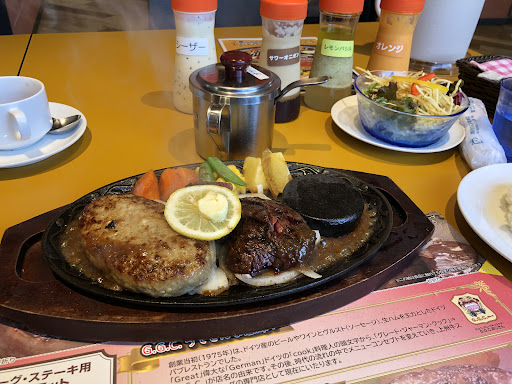 Read more平日昼下がり、ランチにおじゃましました。順番チェックインの機械にとまどいましたがすぐに席に案内されます。 メニューは下調べしてあったカットステーキとハンバーグのセットを注文します。冊子でのメニューにはわかりやすい位置にあるのですが、タッチパネル端末で入力しようとしたらなかなか見つからずに右往左往します。冊子のメニューにコード番号を付与して端末に入力すれば楽だと思いますが… なんとか注文するとコンソメスープとサラダがすぐに配膳されます。あまり期待していなかったコンソメスープですが、旨味がよく出ていて案外いけてます。サラダには4種類のドレッシングが用意されてこれはありがたい。 期待が高まるうちにお肉が登場。ハンバーグは上州牛と麦豚の合い挽きです。他店の粗挽きハンバーグとは異なりこちらは丁寧に挽きを重ねたハンバーグです。豚肉の甘さが印象的です。よいお肉を使用しているだけにスパイスに頼ることなく旨味を存分に味わうことができますが、最後の方はやや甘すぎる印象になってしまいましたが… ステーキの方も柔らかくて食べやすいですね。安いステーキだととにかく顎が疲れますが、ここは肉の旨みがんばり口に広がる感じがしあわせです。 お料理もスタッフさんの接客も満足ですが、次に家族連れて来店を決意したものの、エントランスの階段に愕然としました。これでは車椅子の母を連れて来ることができません。いいお店なのに残念。星...