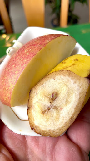 一緒にお皿にあるフルーツはバナナとリンゴ☺️かわいい✨今時のランチにない嬉しさがあります😌