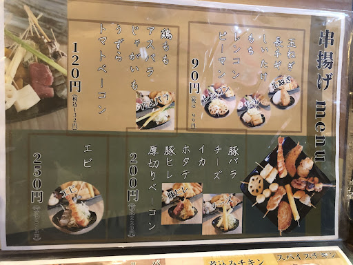 ●串揚げは250円、200円、150円、100円という価格で様々な種類の串揚げが提供されており、おまかせで盛り合わせを注文したところ250円と200円のもののみで構成された串揚げの盛り合わせが出てきました。 ●串揚げメニューに「ホルモン」とのみ表記されたものがあり、牛ホルモンのフライは珍しいと思い注文したところ、中身はちくわでした。店員さんにお聞きしたところ、「富岡のB級グルメに“ホルモン”と呼ばれるちくわの揚げ物があるんです。」と言い慣れた口調であっけらかんと言われました。こちらとしてはそんなことは承知していなかったため、騙された気分でした。 ●馬刺しはメニュー表の写真と提供されたものは大きくかけ離れ、脂身が大半の筋ばった肉がたった5切れにも関わらず価格は1000円越えで驚きました。 ●1個120円?の唐揚げは大きさにばらつきがあり、値段の割に極端に小さいものがありました。 ●ビールは、ものによっては酸味を感じたことから、サーバーの清掃が行き届いてない様に思えました。