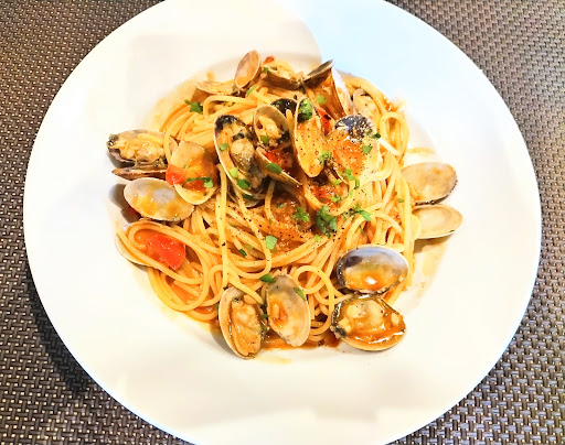 たっぷりのアサリから出た旨味とガーリックの香りを纏ったオイルに、フレッシュなイタリアンパセリの清涼感とブラックペッパーのスパイシーな香りが合わさり、何とも言えない濃厚な味わいが口に広がります。 勿論麺はスパデッティを使用し、濃厚なオイルに負けないモッチリタイプで美味しい。