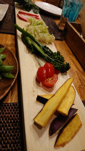 バーニャカウダー、いいですね。 1人500円で90分食べ放題。国産野菜。 食べた事ない食材がでてきました。 写真付き説明もあり、これは何?と 新しい発見がありました。