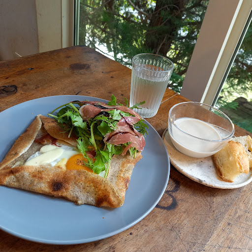店内のインテリアや使っている食器も素敵。木漏れ日が差し込むゆったりとしたおしゃれな雰囲気のカフェです。2人でお茶をしに行ったのですが、ガレットが美味しそうだったのでガレットはシェアすることに。他の方が50分かかったと言われてたので心配でしたが、私達の他に4組程だったからか15分くらいで出て来ました。ガレットもケーキも美味しかったです。