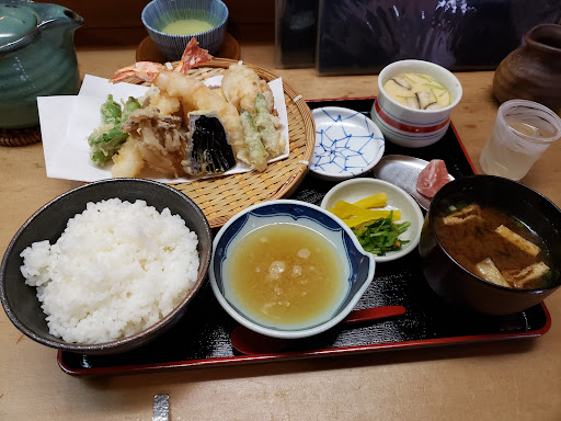 天麩羅定食(1620円)を注文、目の前で揚げる音が食欲をそそります。 ラーメンの湯切りみたいな感じでしっかり油を落とし、アツアツで出てきます。 エビはすごく柔らかい、うまい。衣は薄めなので胃もたれしにくい。鶏天(多分上林地鶏)、柔らかい、うまい。