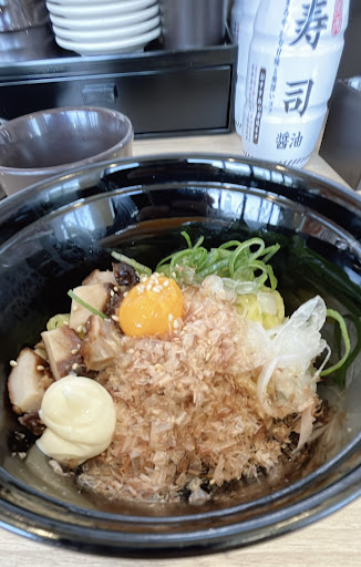 フタを開けると…これでもかってぐらいに鰹節の掛かったまぜそば。それなりに美味しい。けど…量が圧倒的に少ない(⁎⁍̴̆Ɛ⁍̴̆⁎) ラーメン専門店では、ラーメンにはスープがあるけどまぜそばはないから麺の量が多いのが一般的。 で、この量で495円⁉️ 秒で食べてしまった…詐欺確定。