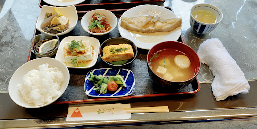 トレイを埋め尽くすお皿は圧巻❣️ お茶碗、味噌汁、湯呑みを除いて7皿は舞鶴市内で最も多いと断言します。これ、1,050円ですよ!?