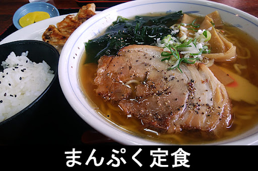 2024年10月25日の午後1時に初訪問。 10月の下旬なのに夏日を記録している今年とあって、この時期でもエアコンをしっかりと効かせている店内は快適そのもの! 暑がりなアタイにとって、中華屋さんの空調は最重要項目のひとつ。 店内に掲げられている料理写真の数々は、セピア色になっていて素晴らしいですな。 老舗ならではの長い時間をかけて醸される色褪せた感じは、常連客が多い証しといえましょう。 そして、入口から2番目の小上がりに着座。 スクラップブックタイプのメニュー帳をパラパラめくって決めたのが、まんぷく定食。 お値段1,150円(平日)で、構成される内容は、選べるラーメン(しょうゆor塩)+餃子(小)+小ライス。 メインのしょうゆラーメンは、色合いが薄めのスープ。 その中に沈む麺は、軽いウェーブのかかった中太タイプ。 トッピングは、チャーシュー、わかめ、メンマ、ナルト、葱。 特筆すべきは、チャーシューの旨さ。 1センチほどに厚切りされてて、存在感がハンパないですな。 しかも、脂身の旨いこと!! とろっとろで、60歳を過ぎた還暦おじいちゃんのアタイでも、呑むように腔内に吸い込まれます。 メンマもチャーシューに合わせるかのように太いタイプ。 これも美味しいねぇ~。 黒ごまが降り掛かった白米も、ラーメン味をリセットする大切な役割を全うする旨さ! なかなか、イイ感じ・・・