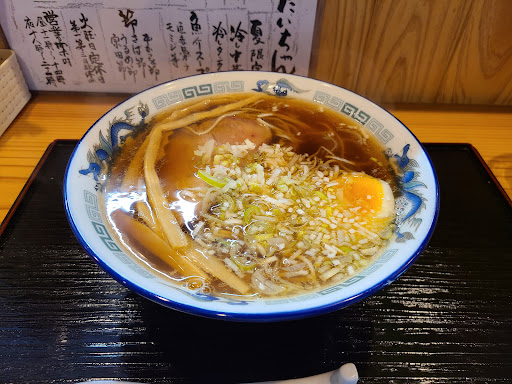 Googleで見つけた麺屋たいちゃんに行ってきました。駐車場は道路沿いと店の東側にすごく広いスペースがあり大きな車で行っても問題ないかと思います。注文は食券を買い渡すシステム、今回塩ラーメン800円(大盛無料で大盛に)を注文しました。店内はカウンター7席、4人座れるテーブル席×2と大人数で行かなければ全く問題ない感じです。ラーメンは最初少し塩味が強いかなと思いましたが麺と一緒に食べていくうちに旨味に変わっていきました。柔らかく美味しい穂先メンマ、少し炙ってあり肉肉しいチャーシュー、煮卵、トッピングもとても美味しかったです。11月4日再訪、しょうゆラーメン800円+ライス150円を頼みました。まぁ普通に美味しかったですが塩の方が麺の旨味を感じて美味しかったかなと(好みの問題もありますが)。ライスは半ライスほどの金額で普通に量がありゴマ塩が掛かって...