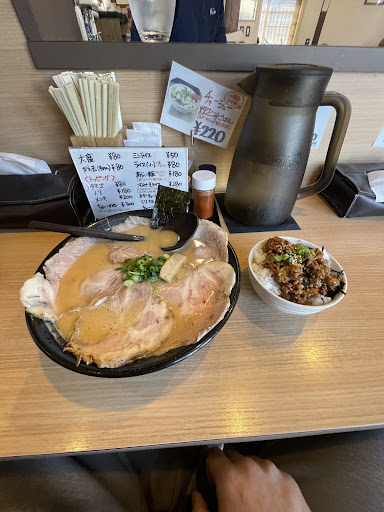 Read more平日の開店に合わせて行きました。普段は混んでいるとの話があたったので開店同時で入ったおかげで空いてました。小上がり席に座りましたがテーブルの高さが低いため体の固い私には足の収納に困りました。掘りごたつっぽい感じだと嬉しいのですが。味噌ラーメンと相方は塩とんこつラーメンを注文しまして、味噌は濃厚味噌に少しピリっと辛さが入って美味しいです。麺は割りとカットしてあるのかズルズルと長いタイプではなくつまんで食べる感じで私的には食べやすかったです。どんぶりが深いのか底から麺がたくさん出てくる感じで、食べごたえがあります。塩とんこつはあっさり塩味でした。肉味噌ライスも一緒に注文してまして、濃い味の肉味噌がライスに合ってご飯がすすむって思いましたが、食べてるとライスに物足りなさを感じてなんだか惜しいなって思いました。あと、チャーシューが柔らかくてめちゃウマです。お店の中は雰囲気も良く、割りと広めで圧迫感がないし、店員さんも笑顔で良い感じでした。次はチャーハ...