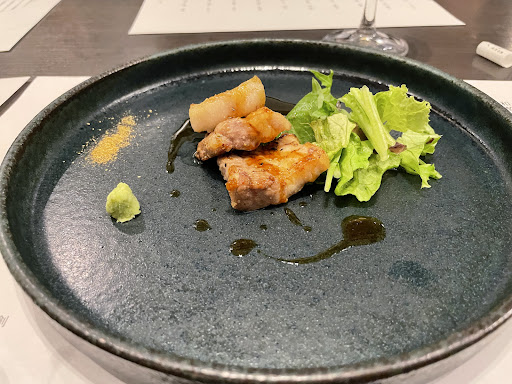 今回はパスタを含めた計5品からなるランチコースを注文しました。前菜は鶏肉の味噌焼き、あんこうのムニエル、カブのムースでした。どれも素晴らしい一品でしたが、その中でもあんこうのムニエルはあんこうの旨味がしっかりと引き出され非常に美味しいものでした。 その後、サラダ、ペスカトーレ、豚肉のトマト煮込みと続き、最後にデザートのいちごのリオレ。