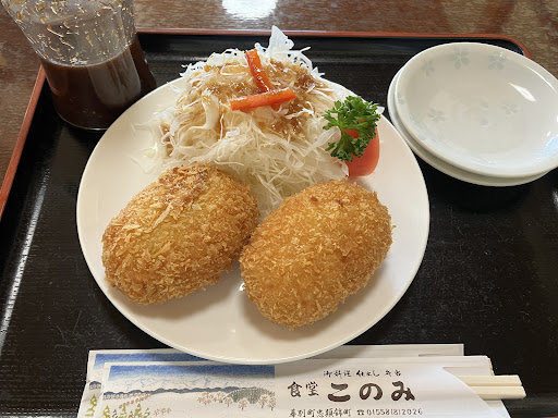 久しぶりに忠類村にある、食堂このみに行ってきました。11時50分頃に入店しました。先客たくさん、後客ぞくぞくです。地元の人気店です。店舗の奥にはたくさんお部屋があって、けっこうな収容数があります。テーブル席にすわります。メニューは、何でもありますね。辛味噌野菜ラーメン850円と相方さんは、鍋焼うどん850円、そして、手作りコロッケ500円を単品でオーダー。15分ほどで着丼です。辛味噌野菜ラーメンはラー油が香ばしく、ピリ辛位です。野菜は白菜が多く、キクラゲ等が入っています。普通に美味しいです。鍋焼うどんは、お餅も入っていて予想通りの味との事。手作りコロッケはクリーミーな味わいで美味しいです。このお店は、何を食べても、普通に美味しいので、安心して食事ができますね。代々続くお店だそうですが、頑張って欲しいお店ですね。また食べに来ます...