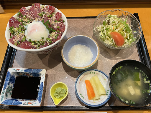 Read more人生初の枕崎へ! 最強寒波襲来で雪混じりの強風に見舞われた日でしたが、どうしても鰹が食べたくて駅から近いこちらに入りました。 魅力的なメニューが多く悩みましたが、ぶえん鰹丼を注文。 お昼時で地元の方がたくさん来られていましたものの割と早めに提供してもらえました。 見た目かなりのボリューム! どこから食べて良いのか迷うほどの盛り付け具合。 まずはわさびだけ付けてそのままで…鰹はもちもち食感で生臭さはなし。 そして醤油(九州特有の甘めのもの)をかけて食べ、温玉を潰して食べ、最後にとろろをかけて混ぜ混ぜして…といろんな食べ方で楽しみました。 また行く機会があれば他のメニューや芋焼酎なども一緒に楽しみたいです。