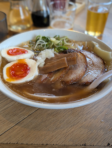 真鶴の『伊藤商店』さんにお邪魔しました。 前日から宿泊していた伊藤家のつぼさんから歩いて30分ほど掛けて、10:40にようやく到着 『伊藤商店』さん 行列も覚悟をしていたのですが、なんとまだ誰も並んでおらず先頭でした。 数分後には後ろに列が出来てました。 さすが人気店。 11:00開店 まずは、ハートランド(600円)で乾杯します。 昼ビール美味しいですね。 伊藤餃子(450円)はデビット伊東さんの奥様が作っていて、その餃子を夫のデビット伊東さんが作るラー油で頂くという『夫婦餃子』 とってもジューシーでラー油との相性も良いです。 黒豚餃子(400円)は肉汁がすごく豚をしっかりと感じられます。 ラーメンは塩スペシャル(1,500円)にしました。 スープは季節ごとに変わるようで、冬は豚骨と鶏の骨をゆっくり時間をかけた豚鶏出汁とサバの骨を焦げるまでローストしたスープが合わせられているそうです。 塩味もちょうどよく、出汁が大変美味しく、具材はチャーシューにワンタン、味玉、メンマ、玉葱にネギですが、どれも大変美味しいです。 特に、ワンタンは餡がしっかりとしていて食べ応えがあり、チャーシューは恐らく低温調理されていて柔らかくて美味しいです。 味玉はトロトロ仕上げでこれまた美味しいです。 最後に会計をし、「ご馳走様でした」と告げると、奥からデビット伊東さんが笑顔で「ありがとうございました」と。 また一つ、再度行きたいなぁと思えるラーメン屋さんに出会えました。 ご馳走様でした。 また伺います。 【店舗情報】 店舗名:伊藤商店 ご住所:神奈川県足柄下郡真鶴町真鶴852 営業時間:不定休 月・火・木・金・土・日:11:00~15:00頃 ※スープ無くなり次第終了 定休日:水 【頂いた料理】 ・伊藤餃子(450円) ・黒豚餃子(400円) ・塩スペシャル(1,500円) 【頂いた飲み物】 ・ハートランド(600円) ーーーーーーーーーーーーーーーーーー 価格  :5 味     :5 雰囲気   :5 清潔感   :5 席の広さ    :4 提供速度     :4 サービス    :5 接客      :5 メニューの多さ :5 デート向き   :4 /5点満点 ーーーーーーーーーーーーーーーーーー 【自分用忘備録】滞在時間:1時間00分(5名) ※人数割りの料金:2,500円