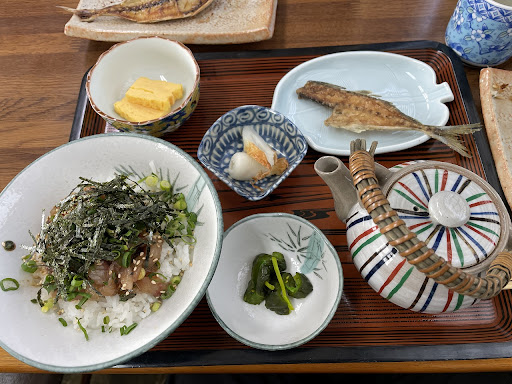 魚伝セットを頂きました。 あじのまご茶(しっかりと味付けされた鯵のお茶漬け)と言うものを初めて食べたのですが、ビックリする程美味しくて、観光地での食事では久し振りに感動しました。 セットの鯵の餃子も、食べる前は、摘入のようなちょっと魚臭い餡の餃子なのかな?とさほど期待せずに食べたのですが、まぁこれが美味しいこと!鯵の旨さは残しつつ、臭みは全く無く、芳醇な旨味とほのかな甘さが食欲を満たします。 サービスの鯵の開きも、綺麗に火が通っていて、頭から尻尾まで余すところ無く美味しく食べられました。 全体的にちょっと塩味が強いかな?と言う印象ですが、大量に汗をかいた後だったのでちょうど良い塩分補給になりました。 過去のレビューを見ると、この定食はもう少し安価な値段で提供されていたようですが、様々な事情があるんでしょうけど、大分値上がりしましたね。 でも凄く美味しかったので、真鶴に行った時は、...