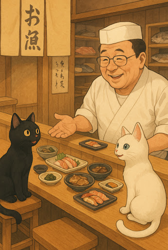 気前の良い大将のもてなしに、吾輩と白はひとくちごとに舌鼓を打ち、互いの目を見合わせては幸せを確かめ合った。酒の余韻に包まれながら過ごすひとときは、まるで長年の友と過ごす晩酌のように温かい。