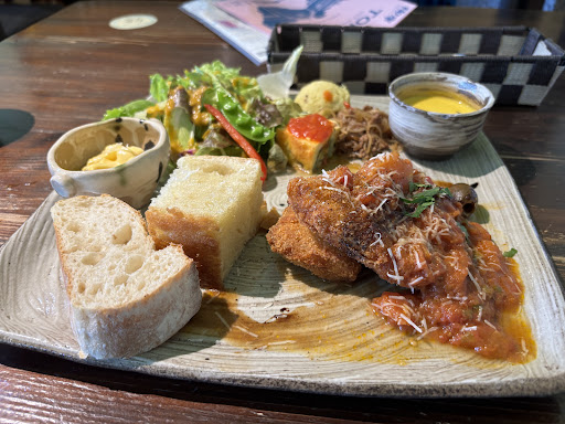 料理については、メカジキのカツレツ・パン付き・前菜サラダ添えランチプレートの感想です。コスパは悪いかなと思いました。高いと思いました。 あと、ドリンクバーについて。 こちらの建物は、おそらく3階建?で半地下もあるような感じなんですけど、ドリンクバーは1階にあるので、階段を移動する席になった場合、取りに行くのがめんどくさいです。特に、私は3階だったんですが、めっちゃめんどくさかったです。 益子焼のカップを使えるのは魅力ではあるんですが、そんなに量のあるカップではないのが残念です。