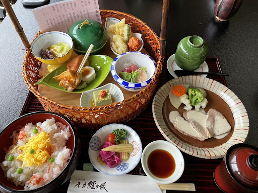 Read moreこの日は愛猫と一緒に益子の森にお散歩に来たので、ランチも一緒にしたくて電話で愛猫とテラス席でお食事出来るか予約しました。電話の応対もらとても良く、テラス席を予約して行きました。テラス席も他の方もいましたが離れてるので、愛猫も落ち着いて一緒に食事を楽しみました。まずは惣誉のぬる燗をちびちびと! 春の季節限定御膳と竹かご弁当をお願いしました。 春のお膳はホタルイカのかき揚げや筍の煮物等、竹かご弁当はアジフライがついてました。アジフライは揚げたてサクサクでめっちゃうまー!春のお膳のかき揚げは残念ながら冷たい、煮物も冷えてるので熱々だったら星5なんだけどなー!でも接客は最高!我が家は味もだけど、接客が1番重視なので、その点では星5つかな。 担当の方は素晴らしい! 本当に気持ちよくお食事出来...