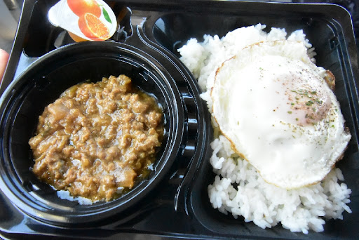 人が全然いないので、弁当一個で儲けようとすると、こんだけの量になるんだといい勉強になりました。 めちゃくちゃ少ない量で、おかずの種類も卵ぐらいなのに、ほか弁より高い。 ボリュームがあるように見える手法のご飯の上におかずオン。 目玉焼きでボリューム出してるだけで、子供の量。 仮に一パック150円としても、卵なんか一個15円。 これは菓子パンレベルで腹の足しにもならん。