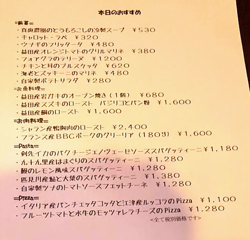 最初はどこにでもあるイタリアンだと思いスルーしようとしたのですが、店の前まで行ってみると『益田産岩ガキ』なと、地場産の食材を積極的に取り入れられてる様子がうかがえたので、これはひょっとしたら当たりの店かも、と入ってみたところ、これが大当たりでした。
