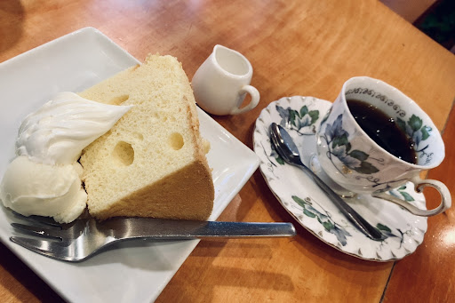 店内は意外と奥行きがあり広々で、かわいらしい雰囲気 マスターは手際がよくママさんは優しい メニューが豊富で外にも大きな看板が立てかけられていました 8時〜11時はモーニングセットもあるみたいです シフォンケーキはバニラアイスと生クリームが添えられていて、フワフワで美味しい フォークを通すとシュワ〜っと音がします...