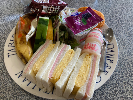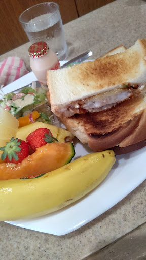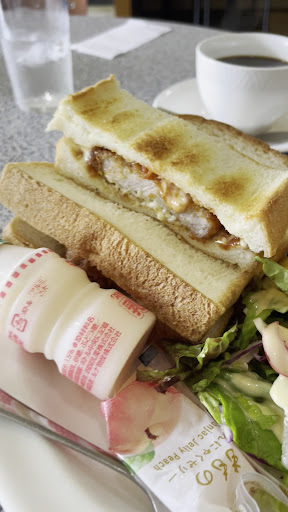 「カツサンドセット¥600」は、揚げたてトンカツがトーストにサンド。キャベツなどは入っていなくてトンカツソースにマヨケチャソースが追加された大人から子供まで大好きな味付け。カツも分厚くで食べ応え抜群です。それにサラダとフルーツ達。バナナ、スイカ、パイナップル、キウイ、ぶどう、果実ゼリーが付いてきます。トマトまるごと1つやヤクルト的なのも。そしてドリンク。これだけついてこの価格は少々バグってる?経営大丈夫なんだろうかw...