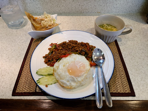 Read moreタイ料理なんて中々食べる機会ないですが、たまたま見つけたお店入ってみました。 メニュー見ても分からない(^◇^;) で、ガパオライス、パットタイ、カイヤードサイ。食べてみました。 オムライス見たいなカイヤードサイを頼んだ家族は、美味しくて喜んでしました。 また、いつも少食で残してしまう者がパットタイ食べたのですが全部食べてしまいました。美味しくて全部食べれたそうです。残したら食べたかったのですが..... 2人とも喜んでました。 ガパオライス食べた私。美味しいけど。もっと辛いものと思い込んでたのでイメージと違う思いながら。 メニューを何度も見直して、辛い料理もある事に気がつき。辛い料理大好きな私が選んだ料理間違ってました。美味しかったですよ!ただ辛いイメージでお店入ったもので。美味しかったのは間違いないです。