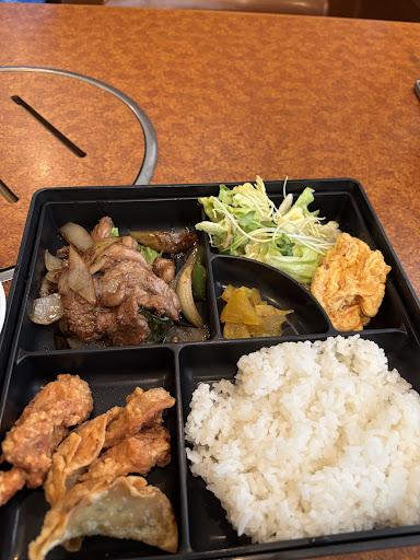運ばれてきた定食は当たりでした。 香ばしく焼かれた豚肉、カリッと揚がった餃子が二つ、唐揚げが二つ、彩りを添えるサラダ、ふんわり卵炒め、そして箸休めの漬物。さらに、スープまでついている。