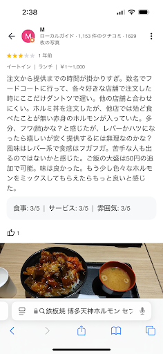 Read moreセブンパーク天美の3階フードコートにあるお店。 平日の12時30分ごろに訪問。 ブラックフライデーで特別価格のにくまる丼(990円)を注文。 通常価格は1,100円。 10分くらいで呼び出しベルが鳴る。 料理を受け取る際に「お箸はこちらから取ってください」との案内あり。料理受取口と返却口の間に置いてあるお箸を取る。お箸の他にレンゲや紙ナフキン、爪楊枝、子供用の食器(プラスチック茶碗、フォーク、スプーン)やホルモンタレ、一味っぽいのんが置いてある。 お盆の上の器は滑りやすいので運ぶときには注意が必要。