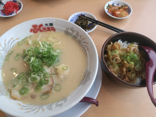 Read more平日の14時ごろ訪問。 先客5名、後客3名。パチンコ屋さんに隣接しているからか、この時間でもけっこう賑わっていました。 ふくちゃんラーメン(大阪とんこつ)焼めしセットを注文。 麺の硬さ(かため・普通・やわらかめ)と、にんにくの量(無し・少・中・多)を聞かれますのでお好みで。 キムチバーにキムチを取りに行っている間2~3分でラーメンと焼めしが到着。 めっちゃ早い。 ラーメンは後味すっきりのとんこつスープに細麺。 チャーシュー、煮卵、ねぎ、のり、メンマ、もやしがトッピングされています。 スープはすっきりしすぎてて何か物足りない感じ。 チャーハンはチャーシュー、玉子、ねぎ、ニンジンが入っている。 ベチャベチャした感じで味も薄めかな? 無料のキムチは辛くなくて旨...