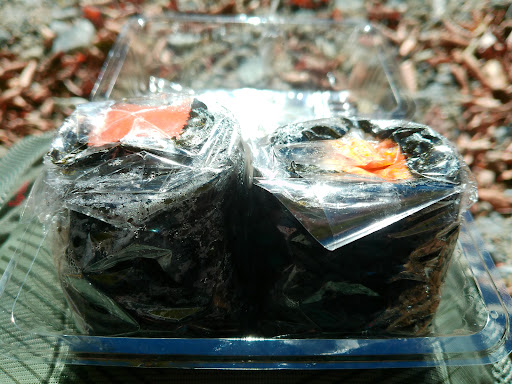 山道を歩くこと2時間以上たち12時過ぎにお弁当タイム。リュックに入れていたのでおにぎりがちょっとつぶれてしまったのはお愛嬌ですが、早速いただきます。