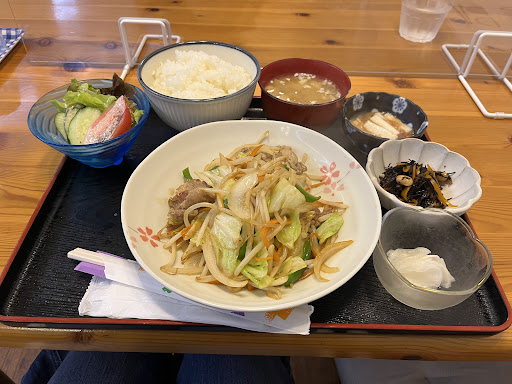Read more住宅街の中にある定食屋さんです。 店内はカフェみたいに明るい雰囲気。 おばあちゃんとお孫さん?で営業されているのかな?お婆ちゃんは常連客とお話したりするマスコットてきです✨ 愛想がよい娘さんが全てワンオペにて励んでます(^^) メニューから妻は茄子のやつと自分はピリ辛炒めを。ご飯の量は普通にしました。 先客なしでしたが後から一人客が二組きました。常連客さんですね。