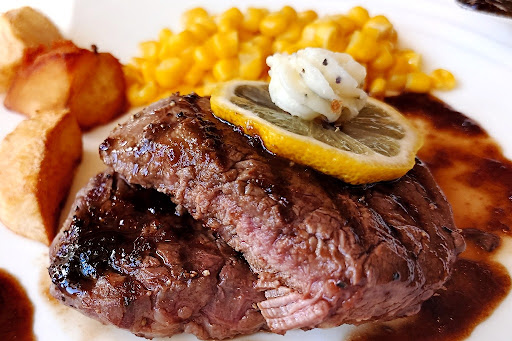 更に15分ほどでステーキ&ライスが到着。提供まで20分ほどかかるので、仕事の合間の昼休み利用の参考に。ステーキにはソースがかけられ、レモン輪切りにホイップバターが載せられる。付け合わせはフライドポテトとコーンで緑成分が少々ほしい所。切ってみるとミディアムっぽい火入れで、赤身らしい歯ごたえが特徴。