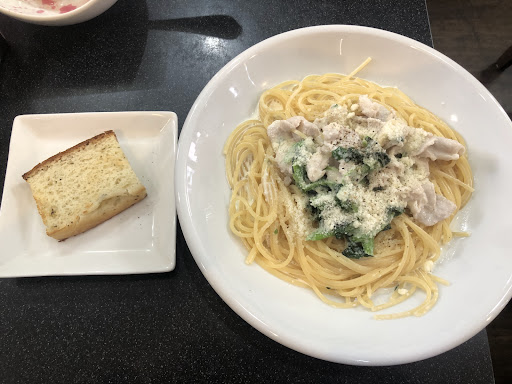 Read more最初に言いますが、私にとって間違いなく★×5です。 土曜日ランチに妻と訪店。 新松戸(幸谷)の流鉄線路沿いにある個人店、ご主人ひとりで切り盛りしてるようです。 パスタのセットはデフォルトでサラダ、デザート飲み物付き。 私たちは、前菜とスープ(ミネストローネ)のセットにして3種のパスタから、ペペロンチーノ(しらすとブロッコリー)、トマト(ベーコンと小松菜)をオーダー。 まず、グリーンサラダ、ドレッシングも美味しい!カルパッチョは真鯛と馬肉かな、これも美味しい、ミネストローネ具だくさん。 次々とテンポよく提供してもらって、パスタ固めゆで、ペペロンチーノは乱切りニンニクとトウガラシが、かなり効いてます。 トマトベースも麺と良く絡んでます。 デザートも3種、普段なら妻に食べてもらうんですがこれは全て頂きました。薄かったり煮詰まったりすることなく、きっちり美味しいコーヒーでした。 これを、ご主人ひとりでやってるのは、凄い! 食器の音がガチャガチャするのは、やむを得ないですね。 流鉄が、近くを通るんでその音と比べれば小さなこと(笑) これで1,600円とコストパフォーマンスも味も◎です。 駐車は近くのコイン...