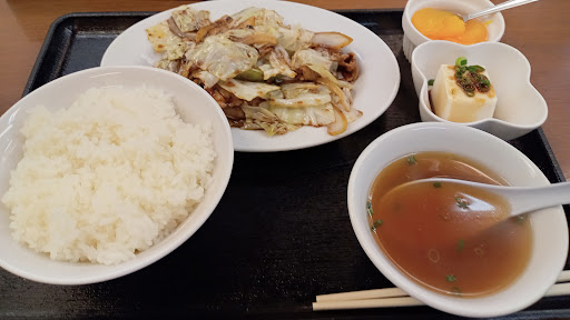 千円札と(なぜか使える)二千円札がなければ店員さんがくずしてくれます。 メニューは基本単品。たとえばホイコーローは640円。定食にするにはライスを追加。 「ライス220円?なんかお高くない?」と思いきや、スープ・冷奴・シロップ漬け(つまりカンヅメ)ミカンのデザートつき! これがまた憎いヤツで、ヤッコと共にお口サッパリ。食事にメリハリをつけてくれます。 よく焼肉屋なんかで帰りにアメとかガムとかくれるけど、ミカンのほうがいいですよ。(※これは個人の感想であり…以下略) 肝心のライスは、どんぶりすりきりドカンと一杯。引き締まった炊き加減、主張しすぎない旨さ。白飯だけでもいける…。そして卓上には(いつも変わらず)キュウリの漬物。 だが、手を出すのはまだ早い。