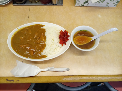 注文の品は・・・ カレーライス(大盛➩680円税込み) 辛さ➩日本レベルの小辛~中辛くらいに想えた。 具材➩豚肉&玉ねぎ&にんじん的な感じ。 (特に豚肉がお子ちゃまサイズでして、 小さ過ぎでした(--;)!!) 東京・下町育ちの僕的に強いて言うと ➩ソースを掛けたかったけど、 卓上にソースが無かったので残念(^^;) (中濃orとんかつソース的な濃厚ソースの事) あまりにもノーマル過ぎる味でして、 何とも言えなかった(^^;) スープ ➩まるで大正時代的な醬油スープなのか? そんな感じに想う稔輝の入ったオールドな味でして、 これも何とも言えなかった(^^;)