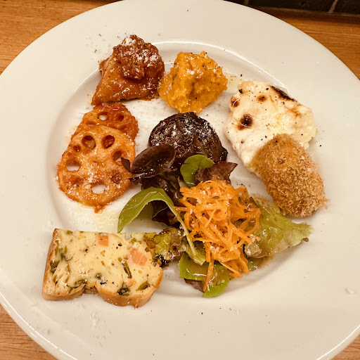 ここのオススメはなんといっても様々な料理が一口づつ楽しめる前菜の盛り合わせ。内容も少しづつ変わっていくので何度も訪れても飽きさせない。