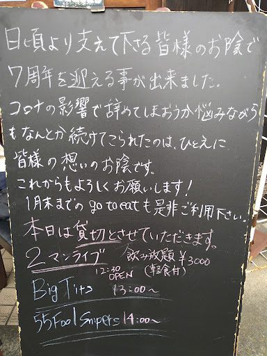 平日火曜19:00に女性2人で予約して行きました。 店内には常連と思われる男性客4人グループ(ミュージシャンなのか時折めちゃくちゃ上手いギターを弾いていた)がいました。 お店の内装は扉開けて右手にドラムセットやアコギなどライブセットが揃えてあり、左手の壁には漫画や本がズラリと揃っていました。 カウンターとテーブル、奥には座敷もありましたが、私達はカウンターに通されました。カウンターの頭上にも遊び心のあるフィギュアなどが置いてあり総合的に面白い店内でした。トイレの中には様々なミュージシャンの近日行われるライブポスターがところ狭しと並んでおり、応援に力を入れていることが感じられました。 お食事は、私達がいただいたほとんどすべてを添付しておりますが、全て、全て美味しかったです。私達の特にお気に入りは3枚目の豚肉のトロトロ煮です。是非食べてみてください。 お酒もノンアルも美味しく、特にノンアルはおしゃれなメニューもありとてもありがたかったです。 また機...