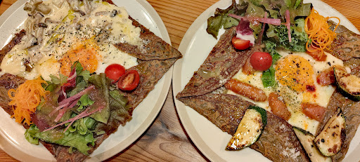 The prices start at 2000 yen but actually it is not expensive if you consider that you get one Galette and a free glass of wine plus additional free softdrink for 90 minutes. You need reservation that you can do online otherwise you can't eat there on the day, place is small and gets soon filled up. Around 3 pm it is less crowded but it is cake time. Their fruit tartes looked very nice, rather expensive. They make the Galettes with locally sourced ingredients and you can't expect any flavorful French cheese or Andouilles of Bretagne even if the name is Breton. They had simple options like smoked salmon, prosciutto, chorizo, mushrooms, ratatouille, that come on top of the egg & cheese base. Actually it was delicious and the 3 staff ladies were constantly working, they have to bake and make the cakes in between too. The atmosphere is a bit crammed and smoky at times since they don't have good windows in that small place so don't expect a fancy restaurant but the food was nice, would go again. It is on top of the pizzeria that we should...