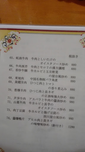 Read moreReally tasty Chinese restaurant. You can find something affordable (around 600 yen) and tasty like tomato itame. Fried beef will cost you around 900 yen. Mabodofu is tasty and cost 780 yen. Various drink from vine to soft drinks are served. Please look for menu pictures attached. I like soup here too, it served always,...
