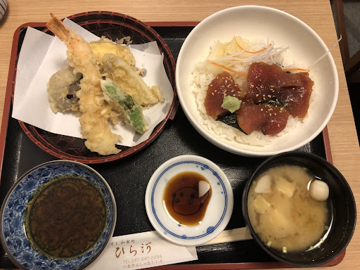 【訪問店舗】季節料理 ふぐ すし 和食処 ひら河 【訪問月時】2025年6月(土日祝)11:52 【待ち人数/時間】なし 【入店時刻】11:52 【混雑度合】空いてる 【着席時刻】11:52 【席数】4人がけテーブル席×3、2人がけテーブル席×3、カウンター席×2 【スタッフ人数】厨房2人、ホール1人 【注文方法】席で口頭で告げる方式 【接客】普通 【注文した料理名】天ぷらと鉄火丼のセット¥1320 【注文時刻】11:53 【メイン料理到着時刻】12:06 【注文~メイン到着時間】13分 【料理の内容】鉄火丼、天ぷら、味噌汁 【料理の味】鉄火丼のご飯は酢飯で、鮪の切り身も比較的大きく一つ一つの鮪の上に山葵をつけていただく。たまに、口直しにガリを頂きつつ酢飯や鮪を頂く。自分としては天ぷらは大根おろしがついてなくて残念だったが、天ぷらそのものは美味しくいただけた。 【支払い】後払い 【支払い方法】PayPay or...