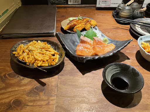 食事は揚げ物と焼き物がメインで、どのメニューも思ったより量が多くて嬉しかったです。 焼き鳥と炙りしめ鯖がおすすめ。 お酒は日本中から集めた日本酒を出しており、日本酒好きの方にはいいと思います。 ビールとサワーは普通の居酒屋クオリティでした。