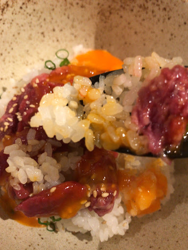 やばいコレ、何の癖も臭みも無くトロトロで新鮮な馬肉に生卵を落とし、さらに白いご飯との組み合わせはまさに、しっかり息の合った芸能人トリオのように清々しいけど濃厚♪