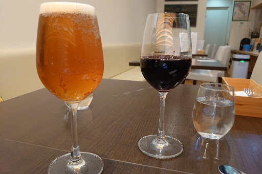 *ハウスワイン赤500円 *スプリングバレー豊潤〈496〉880円 ビールをワイングラスに入れるのは飲みにくいので止めて欲しい。ワインの量は標準的。