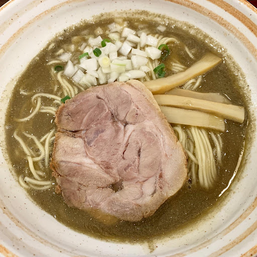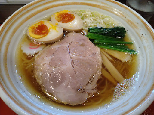 Read more入店したらまず食券を買います。 煮干し醤油ラーメン¥800。 和え玉などの追加オーダーはカウンター越しに現金でのやり取りになりますのでご注意を。 3分ほどで着丼。かなりの細麺なので茹で時間が短いです。 調理を待ってる間ダクトの排気音がかなり気になりますが、昔懐かしいガード下の店だと思えばこれも演出の一つとして楽しめるかもしれません。 ラーメンはおぼんで提供されます。 ビジュアルの美しさもさることながら、まずスープが美味しい。煮干しですがニボニボしすぎてない優しい煮干し醤油味。とてもコク深いです。そしてやや細すぎと思いながら食べ始めると、このスープにはこのくらい思い切った細麺で正解だとわかる。加えてこの麺自体もパツンとした中華麺で麺そのものが美味しい。 さらに印象に残ったのはチャーシュー。よそにありがちな味の抜けた肉ではなくチャーシュー単体でちゃんとおいしい。塩気ではなく染みたスープの味でもなくちゃんと肉の味がする。 ここまでとても美味しかったので和え玉(煮干し粉¥250)を現金渡しで追加オーダー。 ラーメンと同じ大きさの丼で提供されます。 よく混ぜて食べるようにとあったので混ぜにかかりますが麺がほぐれません。四苦八苦しましたが結局は持ち上げた麺にかぶりつくしかなかったです。タレが足りなかったのでしょうか。 しかしスープを加えたら麺はちゃんとほぐれたのでよかったヨカッタ。最後の一滴までおいしくいただけました。 五香駅から徒歩1分少々。駐車場は店前に2台分あります。 こういうホッとするラーメンはいつ以来だろう。 わざわざ行く価値...