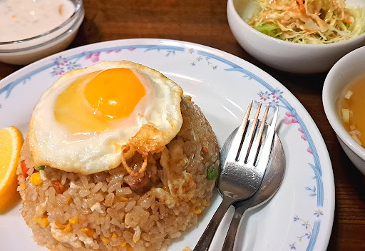 一口食べて、これは日本の炒飯とほぼ同じだと思いました。 ちょっと香ばしくて旨味と色が濃いめの炒飯ですね。 安くて白っぽいのではなくて。 美味しいですけど、タイ感はないです。 半熟の目玉焼きを崩してもレモンをかけても予想通りの味。 大きめに切られた豚肉が多いのは良かったです。