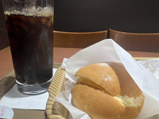 こちらの場所は総合病院があるため、よく前は通っていましたが、初めてイートインをしました。 正直お店の方の対応はん~っという感じ。なんか他の店舗が笑顔での接客なので、それに比べるとちょっと違和感はある物の、別にそこまでの嫌な感じではなかったです。 だいたいこちらにお昼ごろに行きますが、商品が偏っています。 あまり品数が多いわけではないのですが、それでもさらに偏りがあります。 結果的にこのクリームパンを注文。アイスコーヒと一緒に・・・