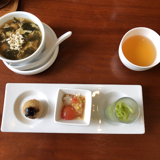 麺飯は、冷やし豆乳担々麺かお粥の選択です。 冷やし豆乳担々麺にしました。 担々麺ですが白い色合いで、食べてみると冷たくさっぱり。 豆乳のあじわいが優しい感じで、つるつるした麺もいいです。