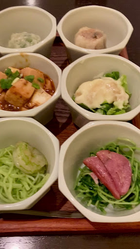 そして小さな飲茶は、 天津が3種類、 真ん中には麻婆豆腐や、 春巻き、 よだれ鶏に、 小海老のマヨネーズソース、 豚舌と豆苗の和え物など。