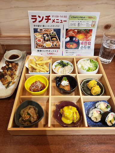 Read moreお昼にショーケースに並んだアレコレを見て入店。 でも中に入ると、ランチメニュー(二種類)しかやってないとの事。 寒い日だったので、純豆腐と悩みましたが、仕事にニンニク臭が影響しては…と思い、ランチボックスをチョイス。 後から出てきたチヂミなのに、それも熱くなく、見事に全て!が冷えた料理。右上のサラダは写真とは違うし、ドレッシングも無しなのでしょうか?そして…物足りない。 食べ終わった後、実は同じフロアの飲食店をハシゴしてしまいました。 店内に入ってランチメニューだけと聞き(しまった…)と思いましたが(実際席に案内された後、出た方もいましたね)入り口にランチメニューの大きな看板はあっても【お昼はコレだけです】という案内板はありましたっけ? 会計の時に、レジのメガネの男性に「外のメニューは何時からですか?」と聞いたけれど、目も合わせずボソボソ。聞き取れなかったので、もう一度聞き直しましたが、またボソボソ。 結局分からないので、もう行きません。 1人でも寄りやすい韓国料理は嬉しいのです...
