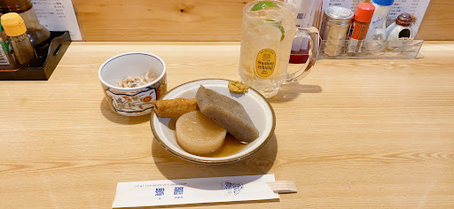 ●お料理 ハイボール、アジフライ、イカのお造り、おでんをオーダーしました。 特に印象的だったのがおでん。 私はコンビニのおでんも自分で買ったことはなく、また金沢おでんの有名店もそこまで…というほどあまりおでんが好きではありませんでしたがカウンターの前にあったためとりあえずオーダー。 大根は芯まで味が染みており、こんにゃくは2センチほどの厚みがあり食べ応えがありました! つゆは濃くはありませんが、出汁がきいていてしっかりとした味です。